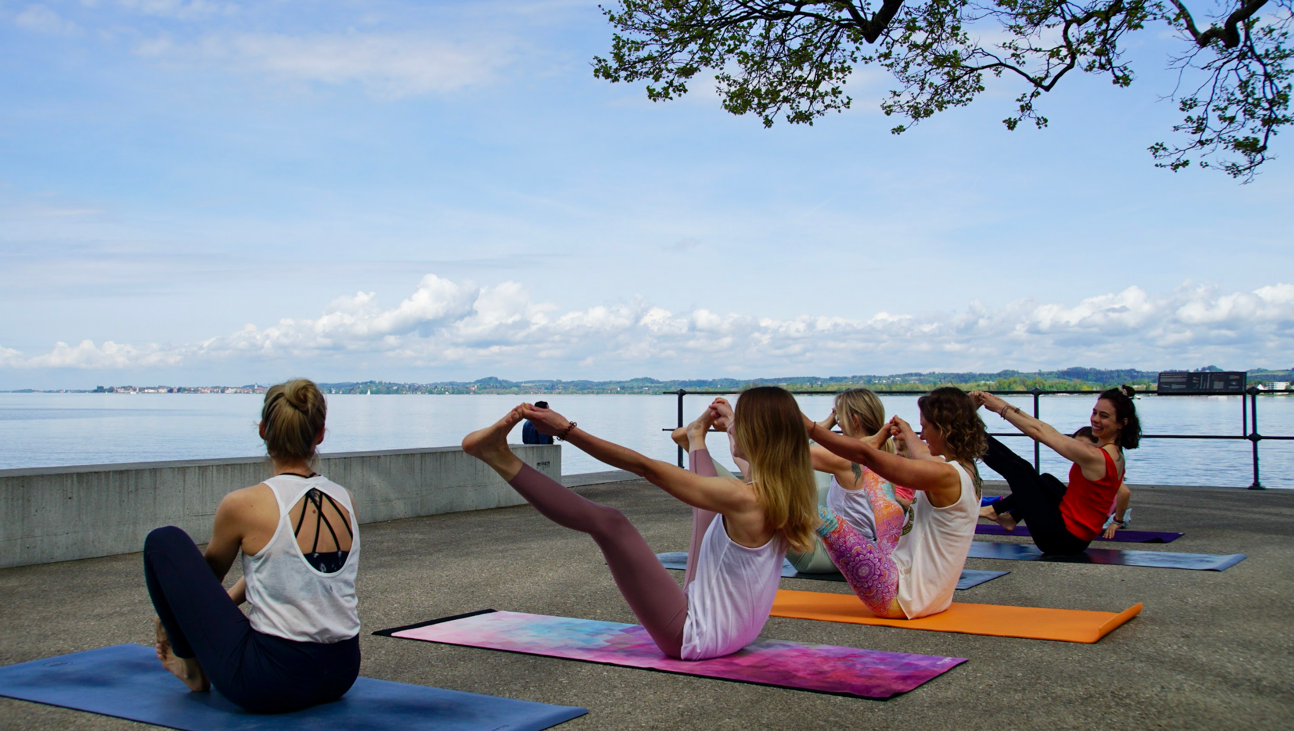 In Bregenz kann von Juni bis August bei schönem Wetter an verschiedenen Plätzen direkt am Seeufer mit herrlichem Blick auf den Bodensee Yoga gemacht werden.